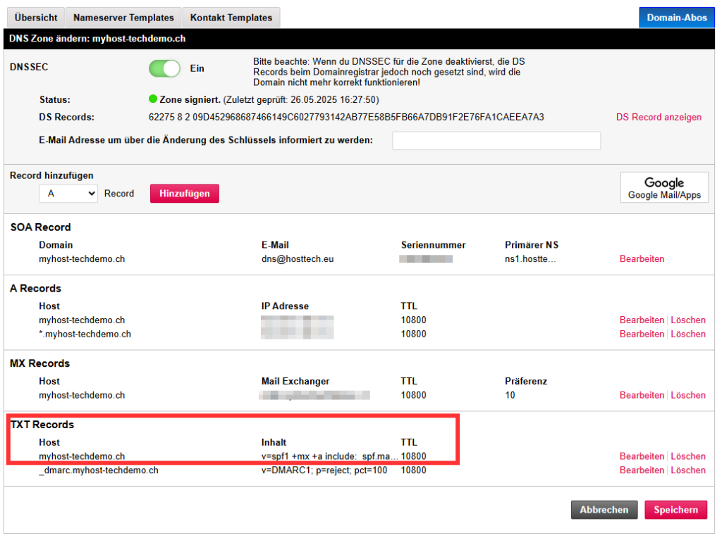 Bei uns kannst du den TXT-Record in deinem myhosttech Kundencenter hinzufügen, wenn du links auf „Domains > Domaincenter“ klickst, und danach rechts, bei deiner Domain auf „Details > DNS Records“.